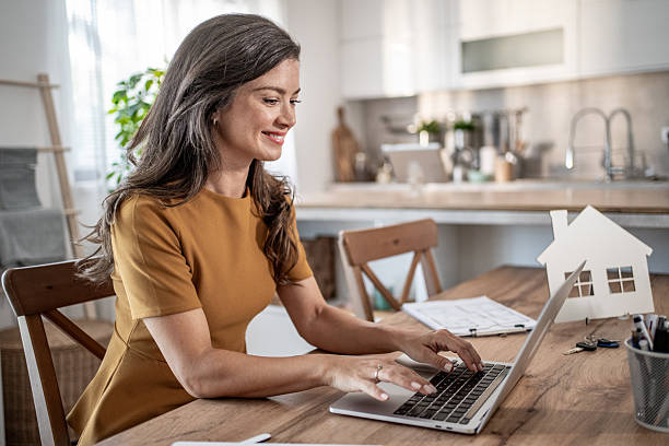 Mid adult female real estate agent smiling while typing on a laptop at a home office desk with a house model, managing property listings and remote business tasks seamlessly